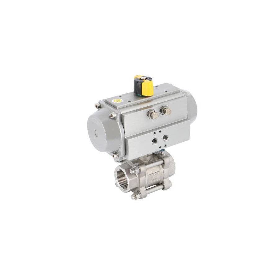 Le robinet à tournant sphérique 3 pièces inox 746 XS a un corps et une sphère en inox CF8M (1.4408) et des sièges en PTFE/verre. Il est motorisé avec un actionneur pneumatique de marque Alphair. PS : 63 bar, TS : 180°C.